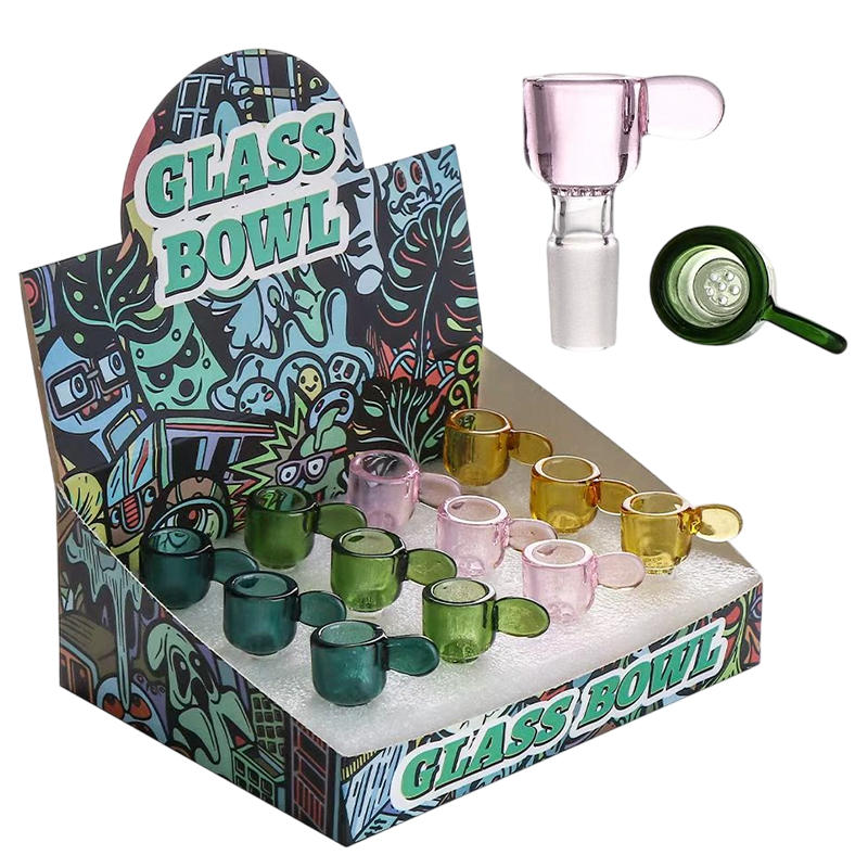 14mm Male Bowl Colour: Light Blue/Pink/Green/Brown Design: Same as picture Size: 14mm Quantity: 12/Display Sold by display!