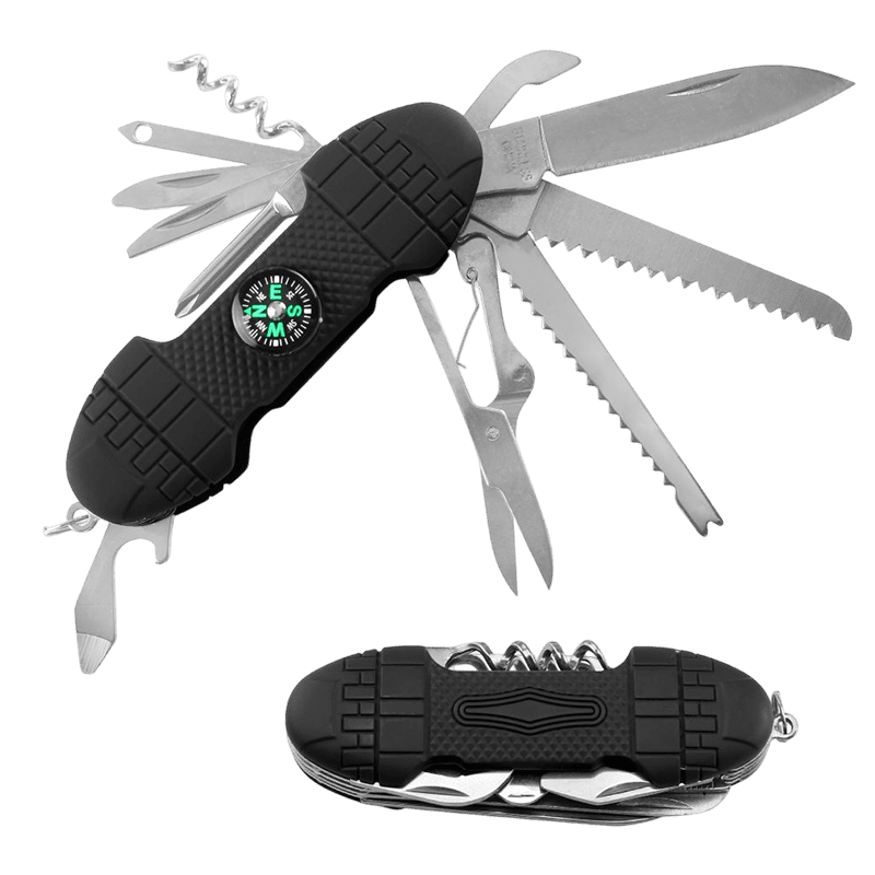 • Includes: knife, scissor, saw, bottle opener, screwdriver, compass, and more.