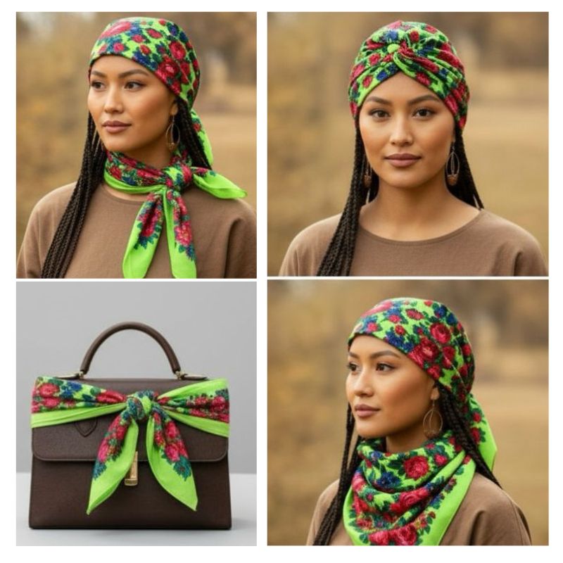 Metallic Kokum Floral Printed Scarf Size: 30″ x 30″ (75*75cm) Colour: Neon Green Design: Floral Quantity: 10/Pack Sold By Pack!