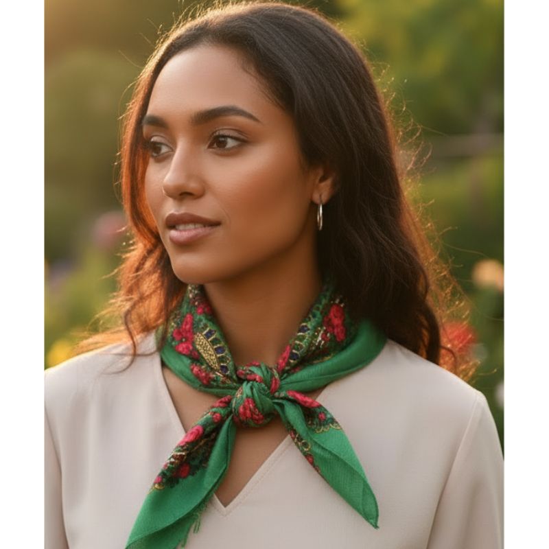 Floral Scarf Color: Green Size: 31″ x 31″ (80*80 cm) Material: 100% Polyester Design: Floral Quantity: 10/Pack Sold By Pack!