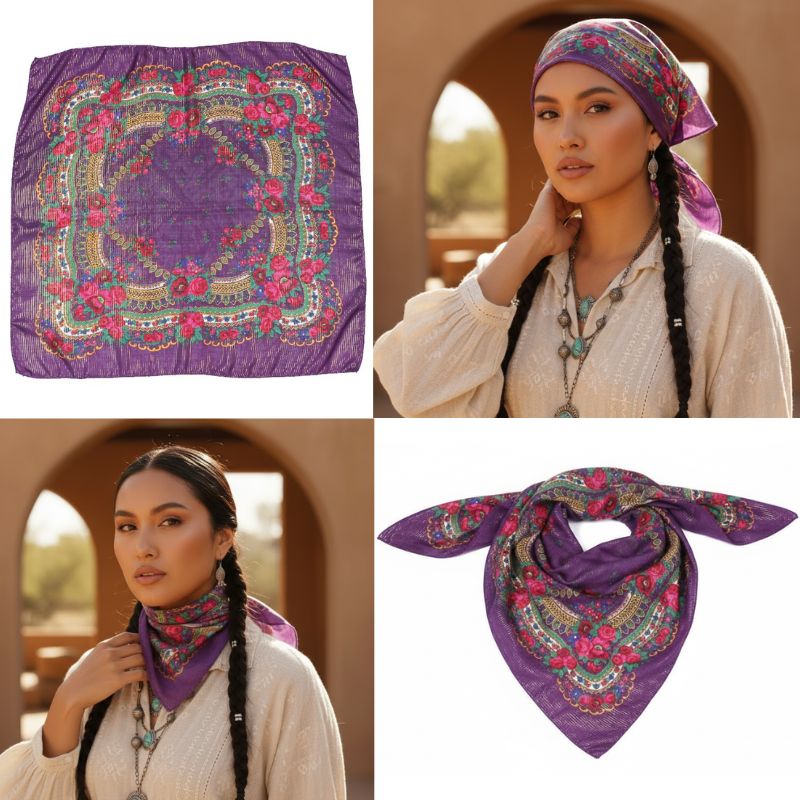Floral Scarf Color: Purple Size: 31″ x 31″ (80*80 cm) Material: 100% Polyester Design: Floral Quantity: 10/Pack Sold By Pack!