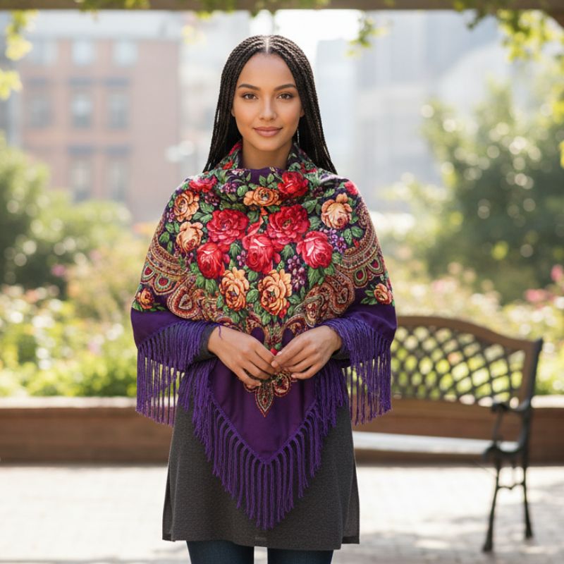 Floral Scarf Color: Purple Size: 51″ x 51″ Style: Fringe Trim Material: 100% Polyester Design: Floral Quantity: 10/Pack Sold By Pack!