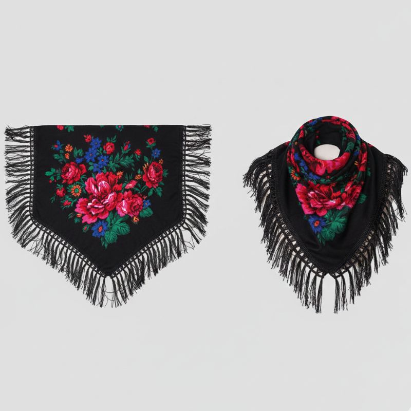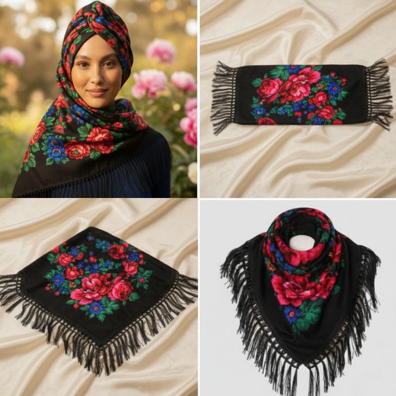 Non-Metallic Kokum Floral Printed Scarf Size: 30″ x 30″ (75*75cm) Colour: Black Design: Floral Style: Fringe Trim Quantity: 10/Pack Sold By Pack!
