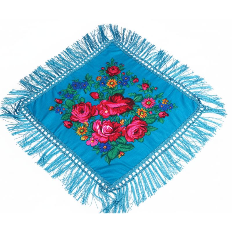 Non-Metallic Kokum Floral Printed Scarf Size: 30″ x 30″ (75*75cm) Colour: Turquoise Design: Floral Style: Fringe Trim Quantity: 10/Pack Sold By Pack!
