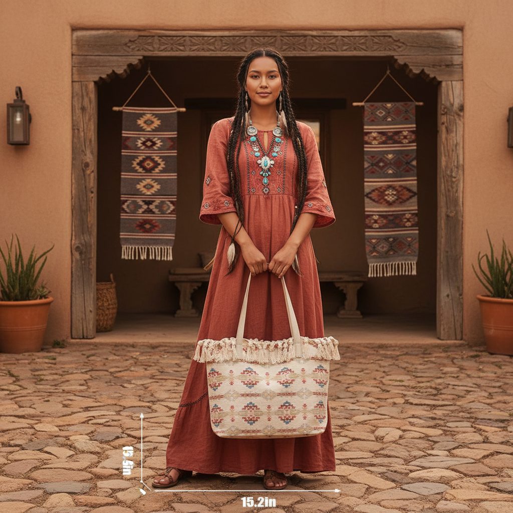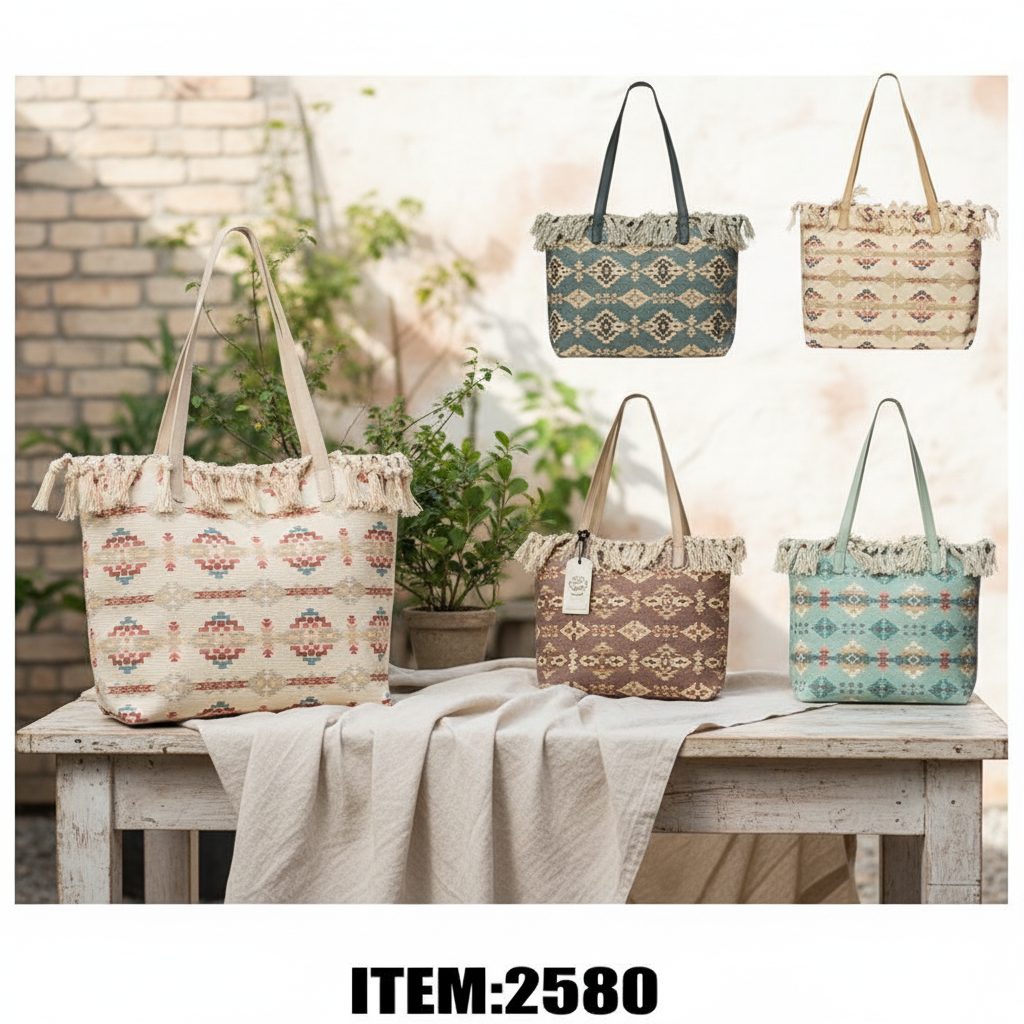 Deluxe Tote Bag with Fringe Size: 26 x 15.2 x 4.1 (Inch) Design: Solstice Design Color: Assorted Style: Tote Bags Quantity: 24/Box Sold by Box Only!
