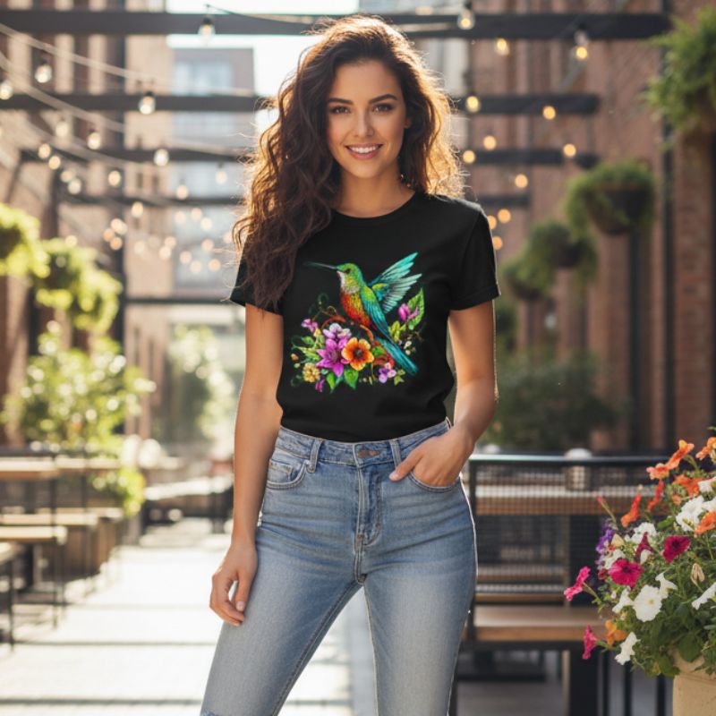 Hummingbird Floral Black T Shirt, Cotton Design: Hummingbird SIze: S-2XL Quantity: 12Pcs/Box Sold by Box!