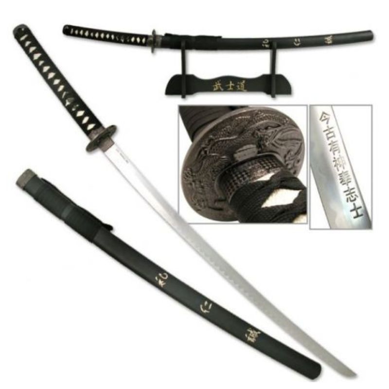 – Matte black scabbard with hand carved Samurai Bushido Code on each scabbard.