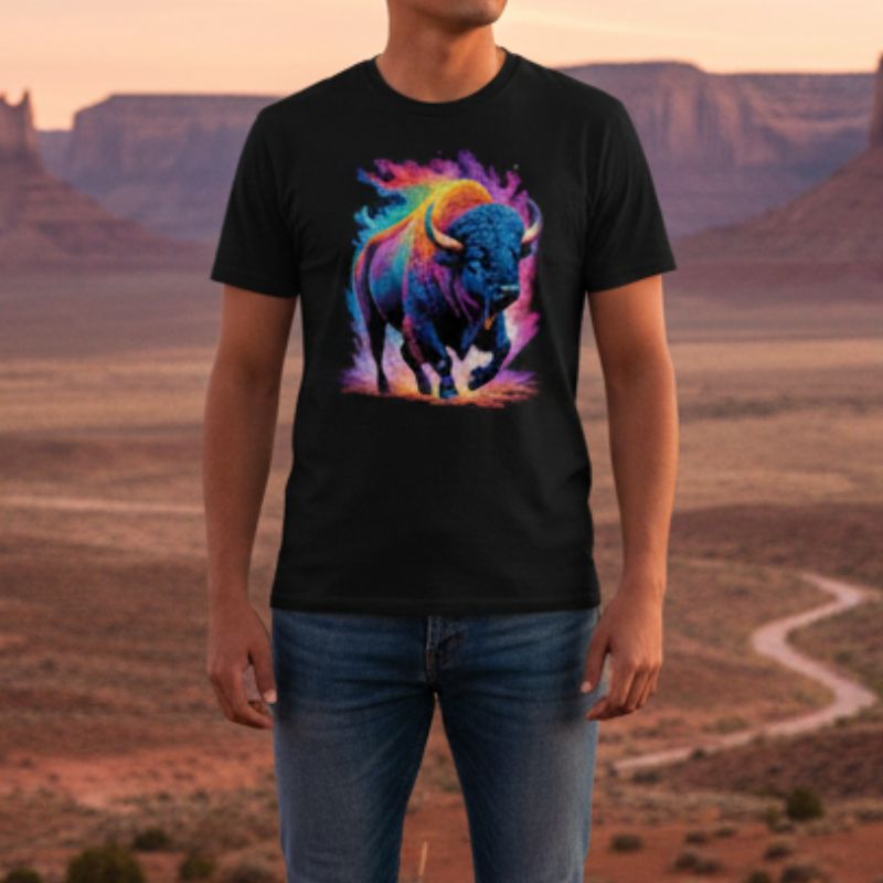 Neon Animals – Buffalo Black T Shirt, Cotton Design: Buffalo SIze: S-2XL Quantity: 12Pcs/Box Sold by Box!