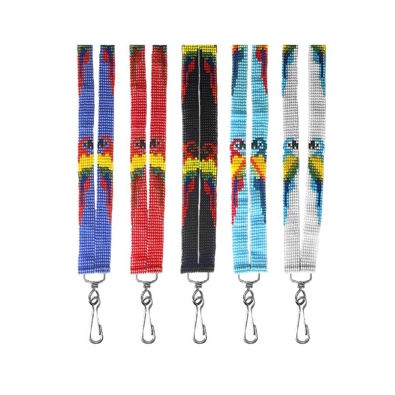 Seed bead wide strap lanyard with multicolored parrot bird animal designs and silver metal swivel hook clasp. Securely holds keys, key chains, badges, etc.