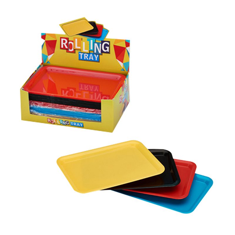 Plastic Rolling Tray Assorted Color-TY-007 Color: Assorted Size: 7x5x0.4” Material: Plastic Quantity: 24Pcs /Display Sold By Display!