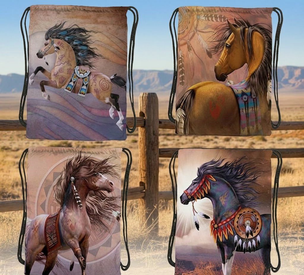 Printed Drawstring Bag Design: Laurie Prindle War Ponies Color: Assorted Size: Standard Style: Drawstring Bag Quantity: 24Pcs / Pack Sold by Pack!