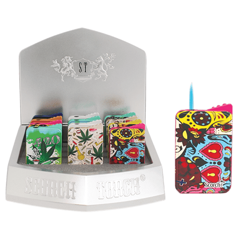 Scorch Torch – Slim Torch Embossed Assorted Designs Color: Neon & Iridescent Height: 2.5″ Quantity: 12 Pcs / Display Sold by Display Only!