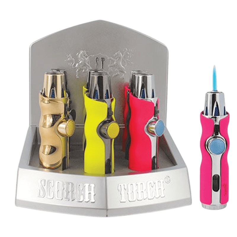 Scorch Torch – Wavy Torch Grip button to lite Cigar punch Solid Colors Height: 4.75″ Quantity: 9 Pcs / Display 8 Displays / Master Case Sold by Display Only!.!