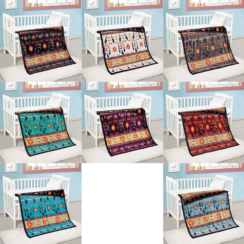 2 Ply Reversible Baby Blanket Color: Assorted Design: Medicine Wheel with Eagle Feather Quantity: 12/Box Sold By Box Only!