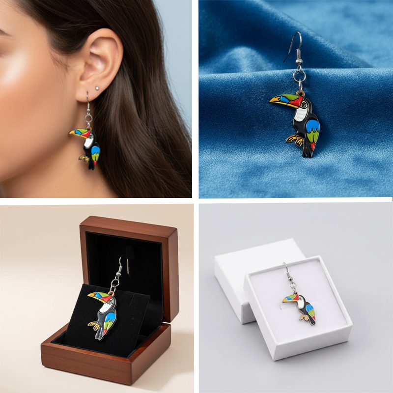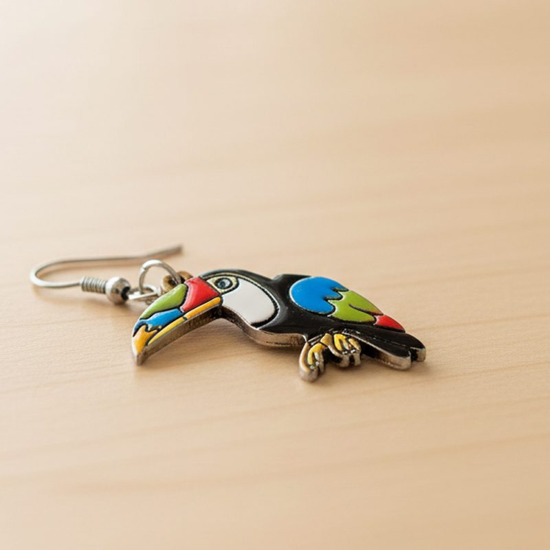 – Multicolored toucan shaped wooden hand-carved dangle earrings