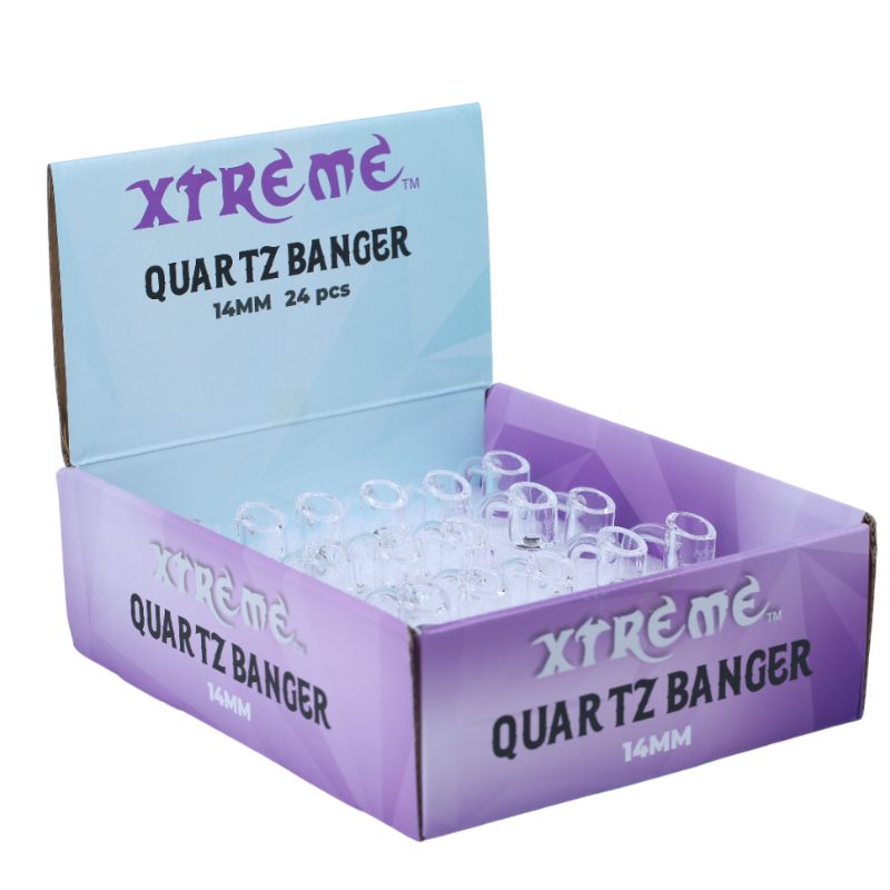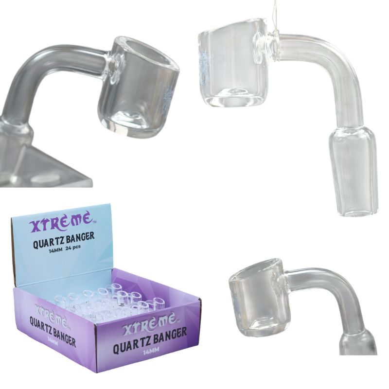 Xtreme 14mm Quartz Banger-Male Joint-90° clear 4mm Wall Thickness Colour: Clear Quantity: 24pcs/Display Sold by display!